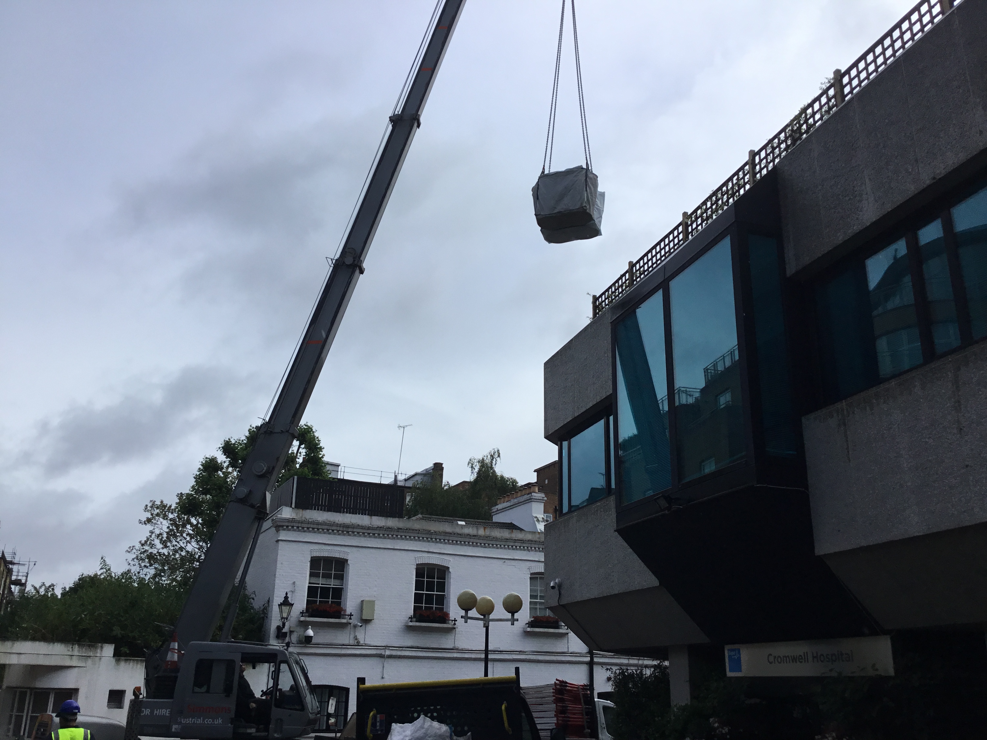 Our crew and the crane operator were up early to get this marquee equipment up to the roof of the Cromwell Hospital before their busy day started ..