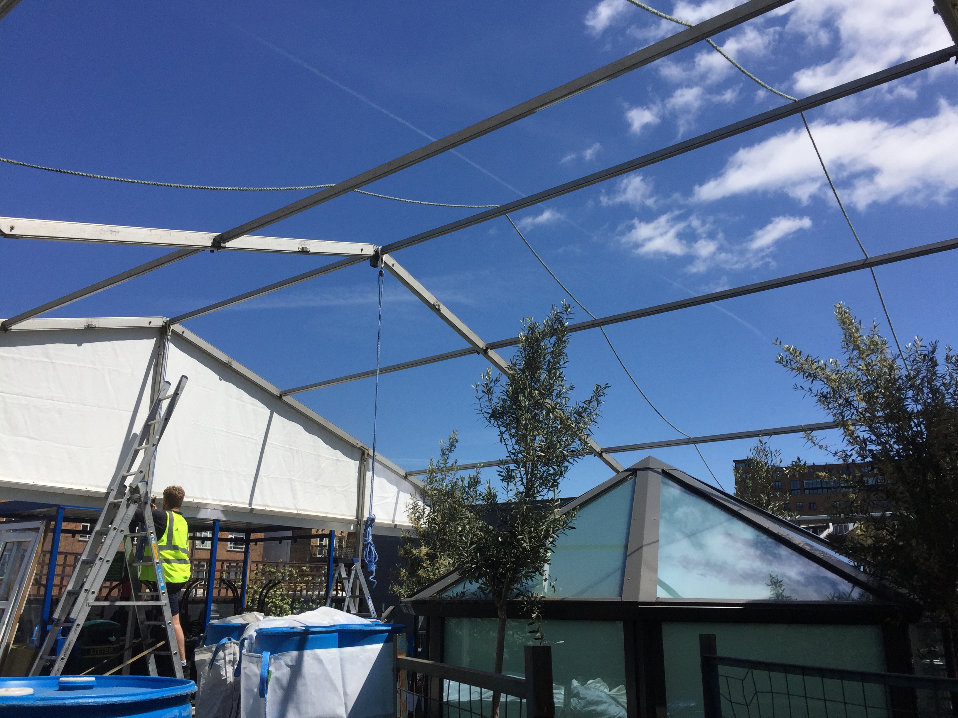 Early this summer we installed a a large clearspan marquee to the roof top of the BUPA Cromwell Road Hospital in London to be used as a temporary staff Dining Room during renovations to the dining hall in the building below.