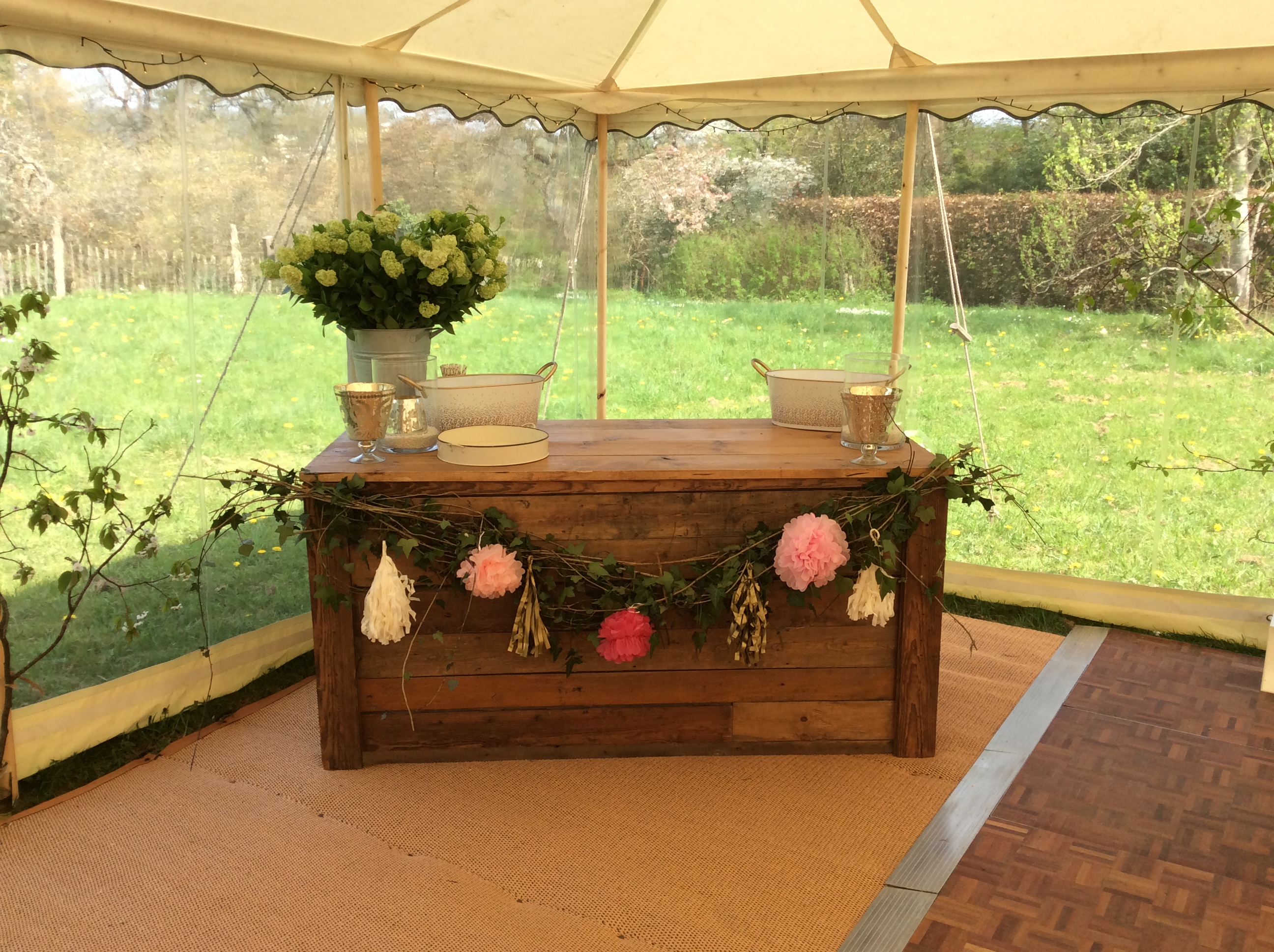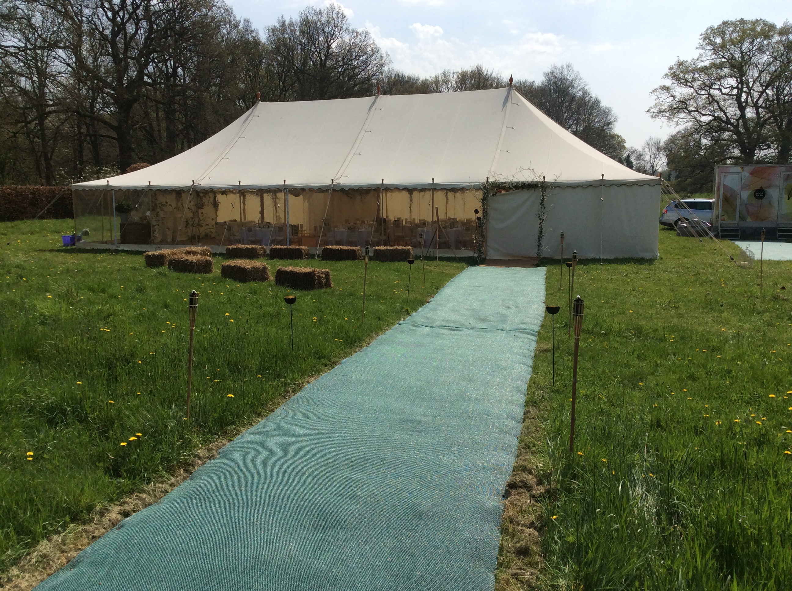 For this our very first wedding this season, the Bride and Groom selected one of our lovely traditional canvas pole tents for their happy day. It was a great decision, and the marquee looked stunning set in the beautiful rural location of Hambledon just outside Guildford, Surrey.